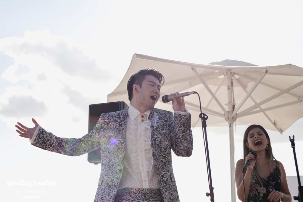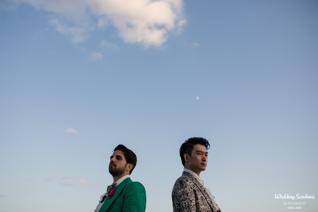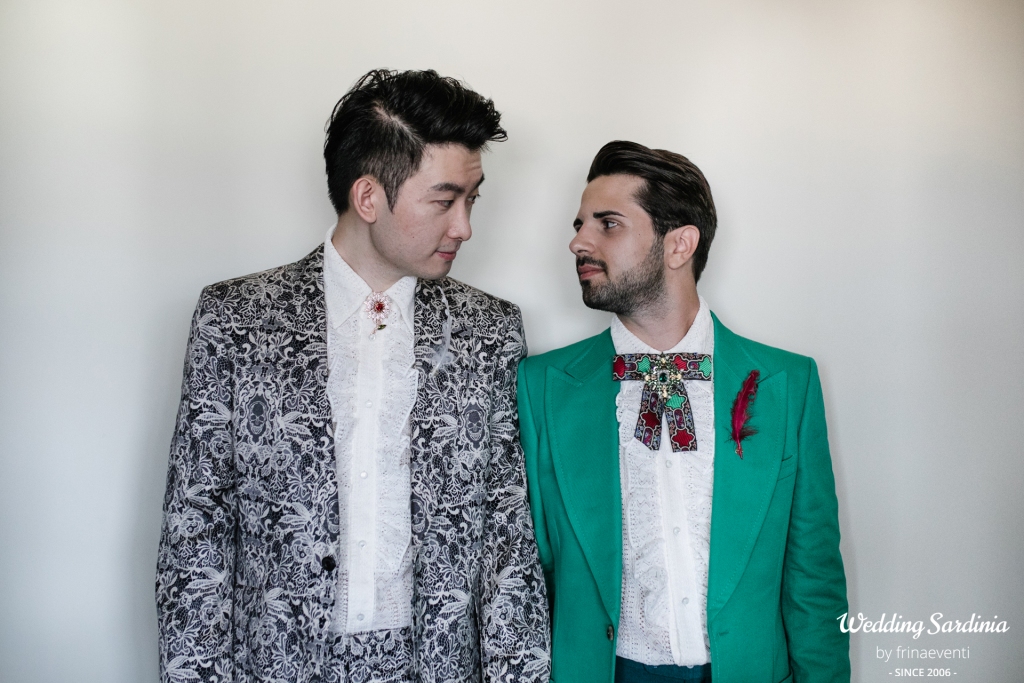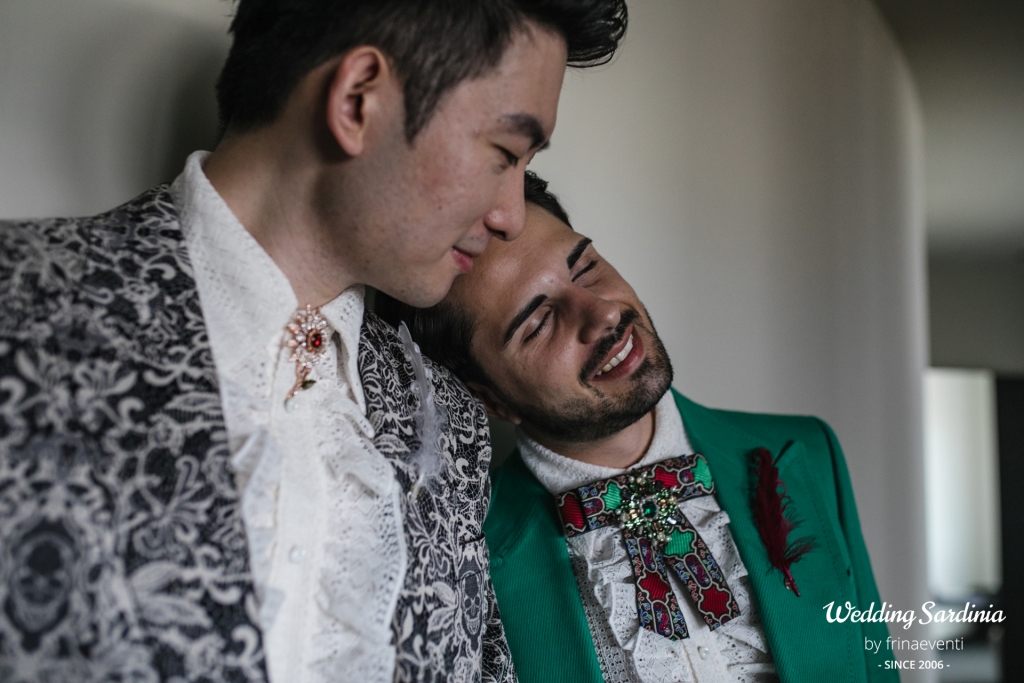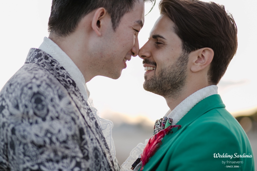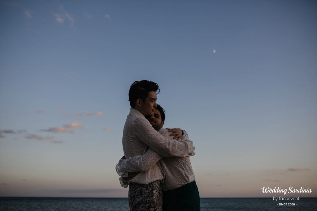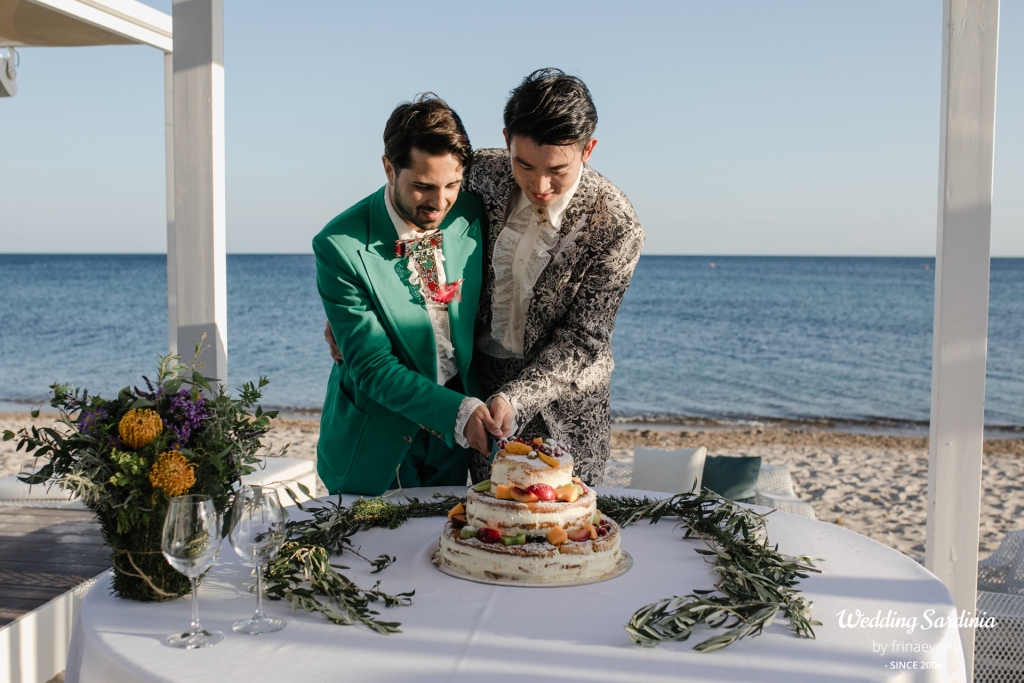 An elegant beach restaurant few km from Cagliari was the perfect scenario for their outdoor reception in October. Their guests could enjoy the warm weather during a rich buffet aperitif with personalised drinks and finger food, followed an elegant the sit dow dinner and cut of the cake. The live music of a duo created the perfect atmosphere and gave Bryan the opportunity to sing a special song for his groom.