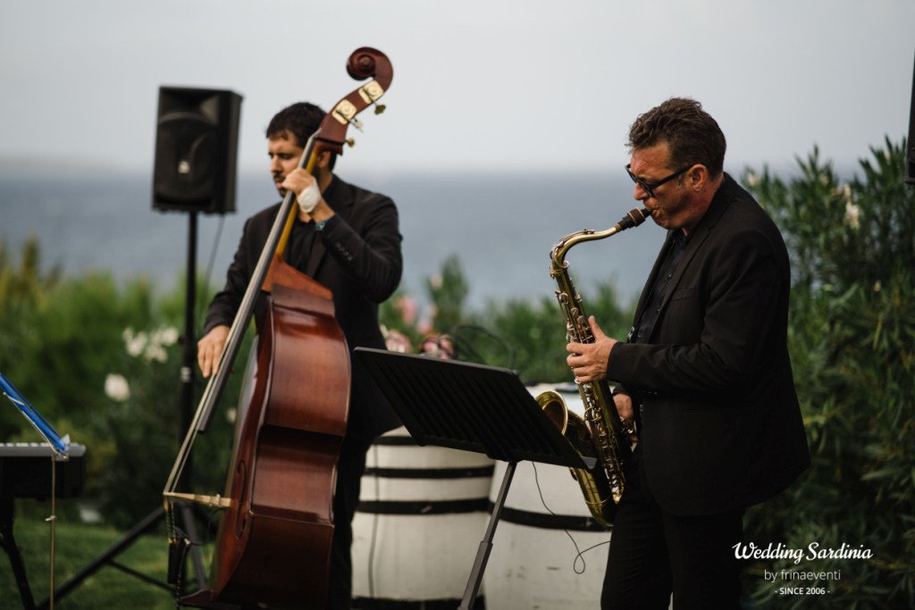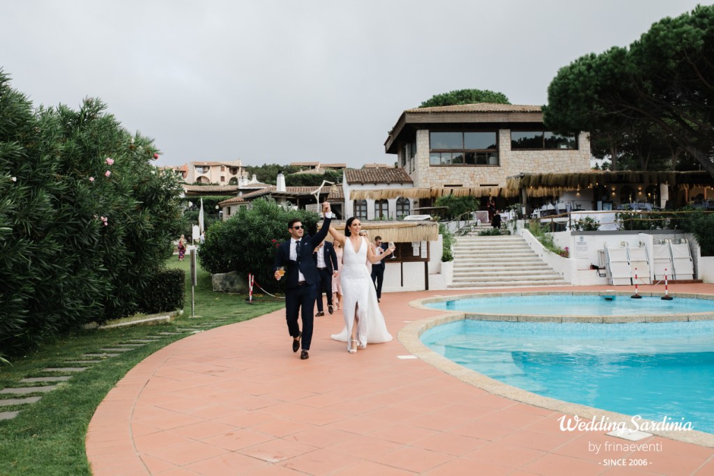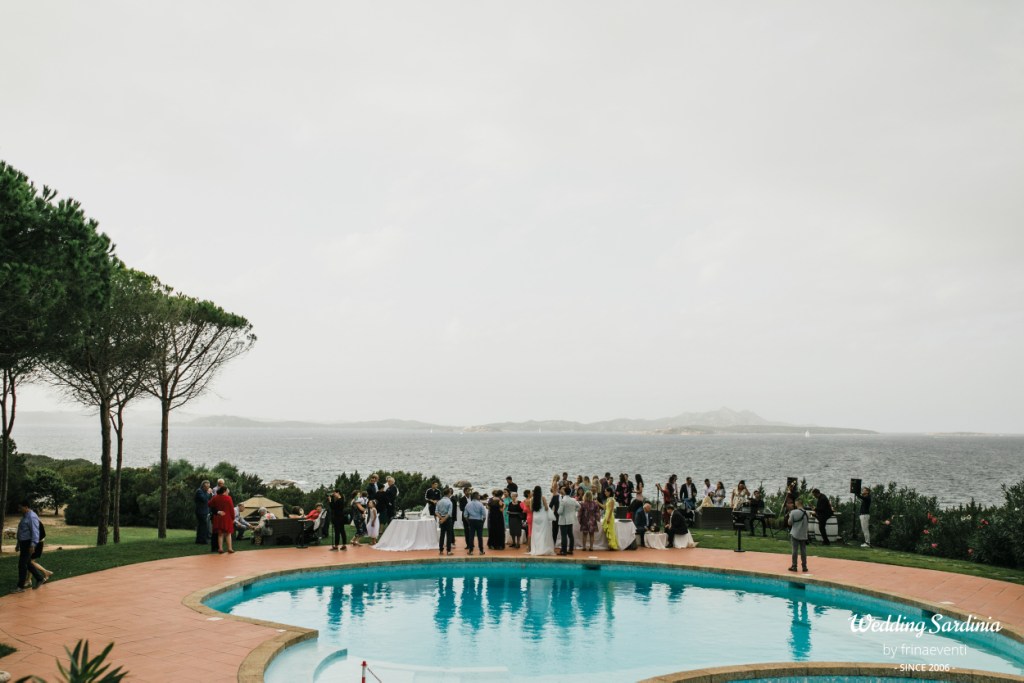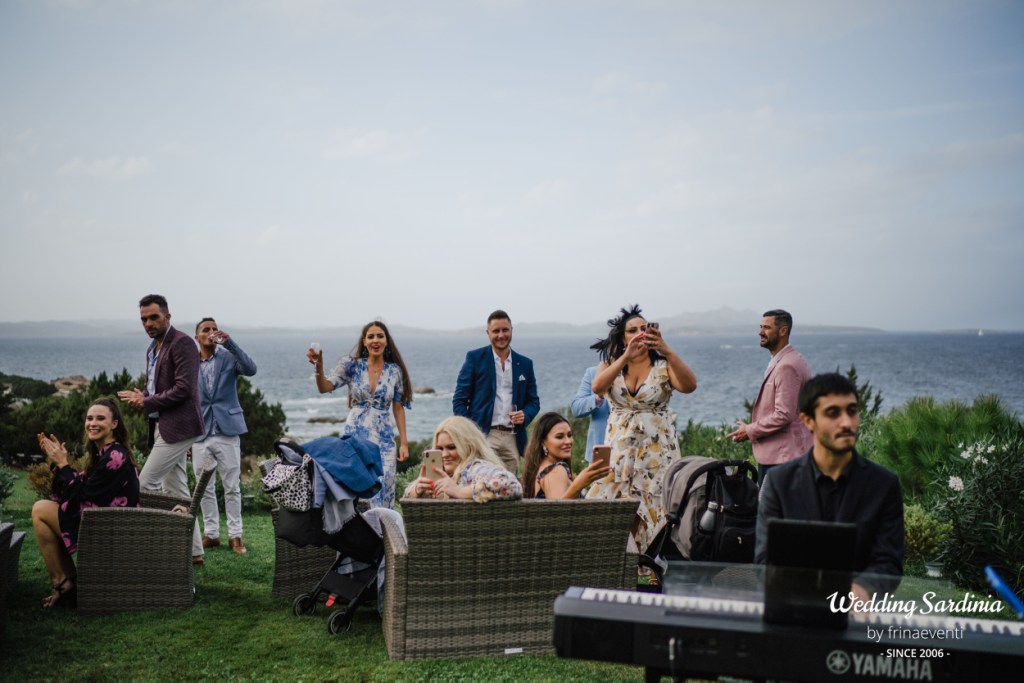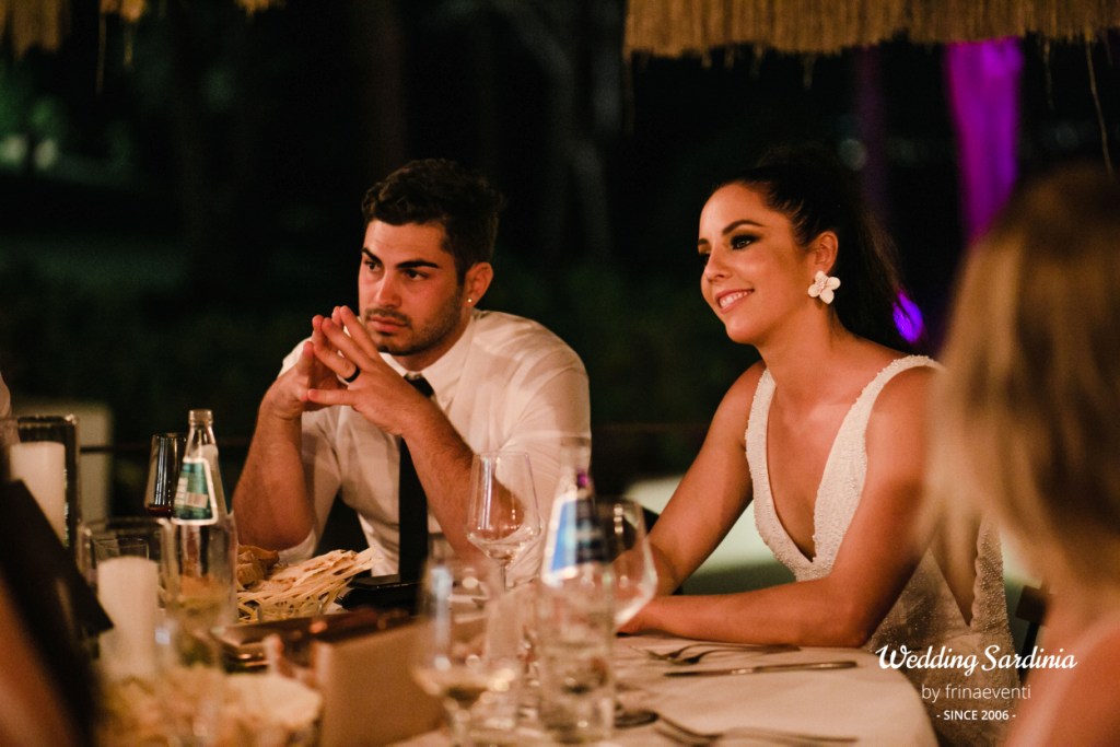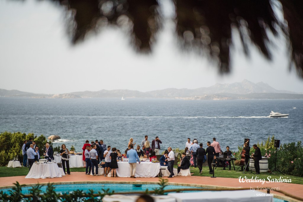 The followig celebrations took place in an exclusive restaurant by the sea in Baja Sardinia, a seaside resort not far from San Pantaleo where the couple and most of the guests decided to accommodate. The live music of a sax band welcomed the couple and its guests for a rich aperitif at pool side.