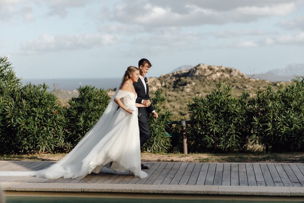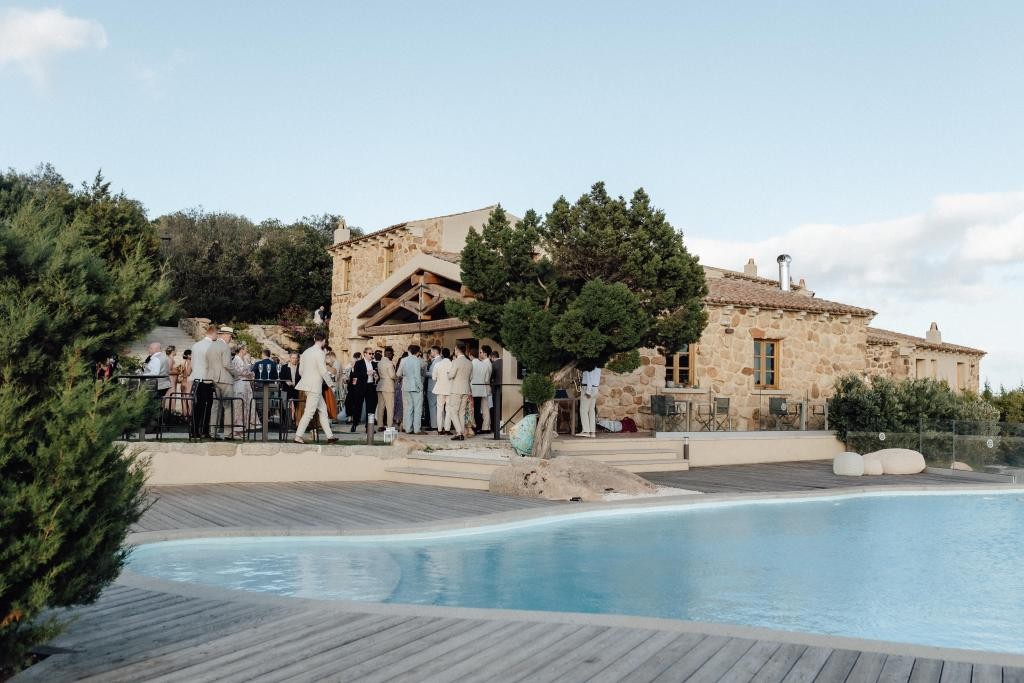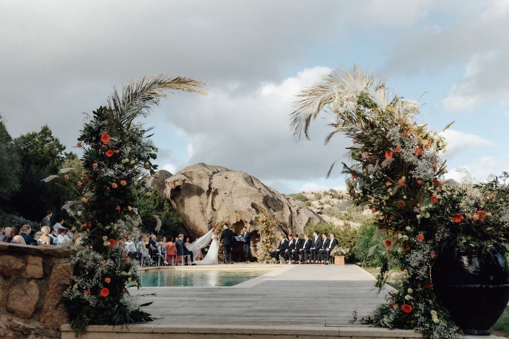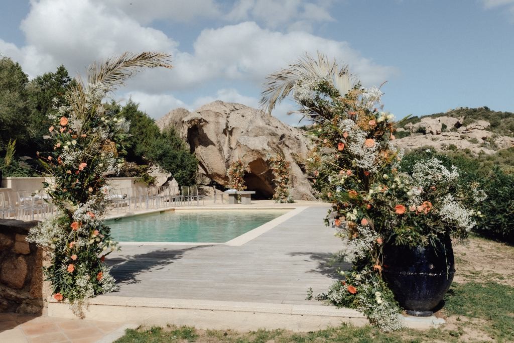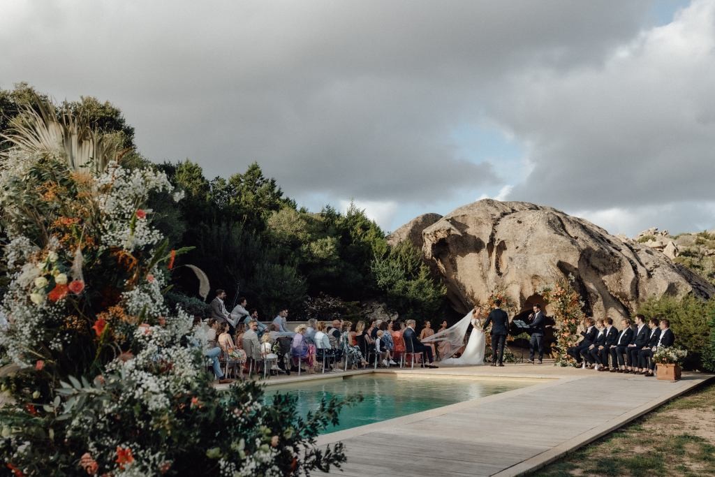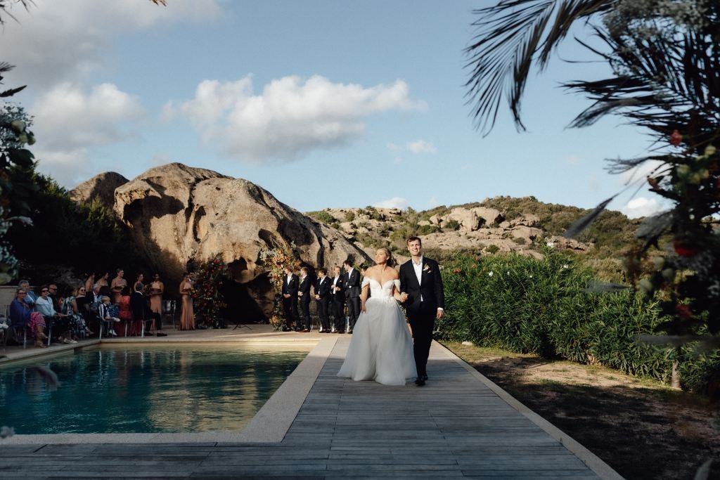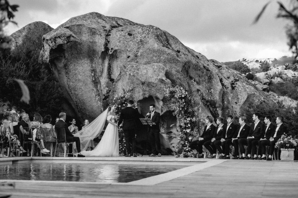 Every moment unfolded seamlessly on site, with everything within walking distance. Their romantic ceremony took place by the villa’s swimming pool, framed by a majestic granite rock—an iconic symbol of Gallura’s rugged beauty.