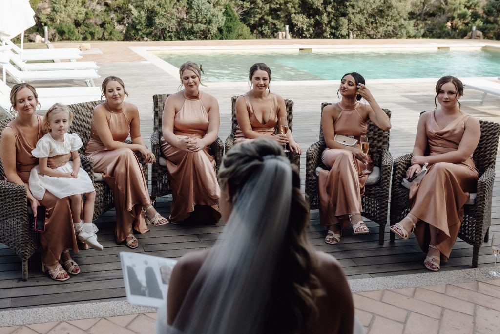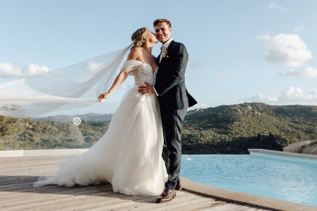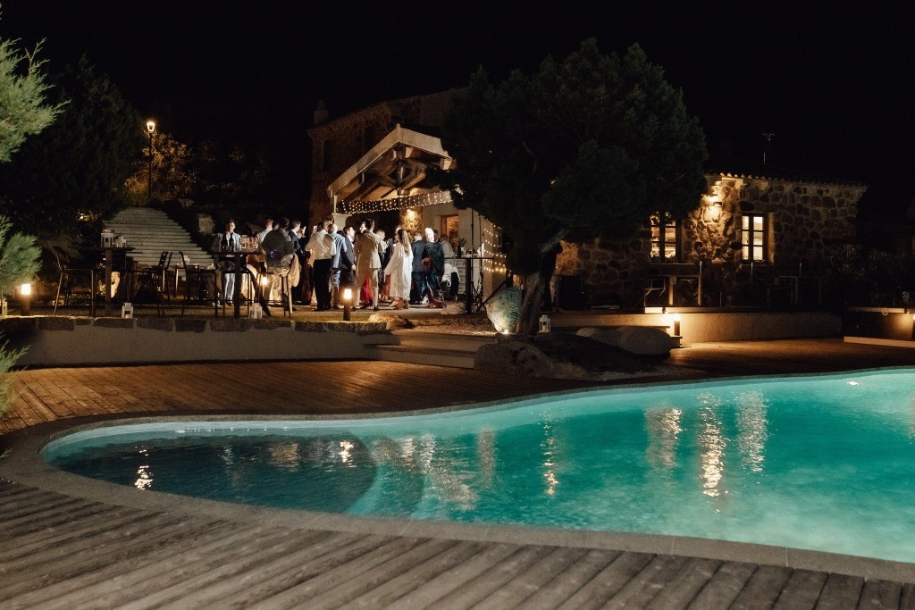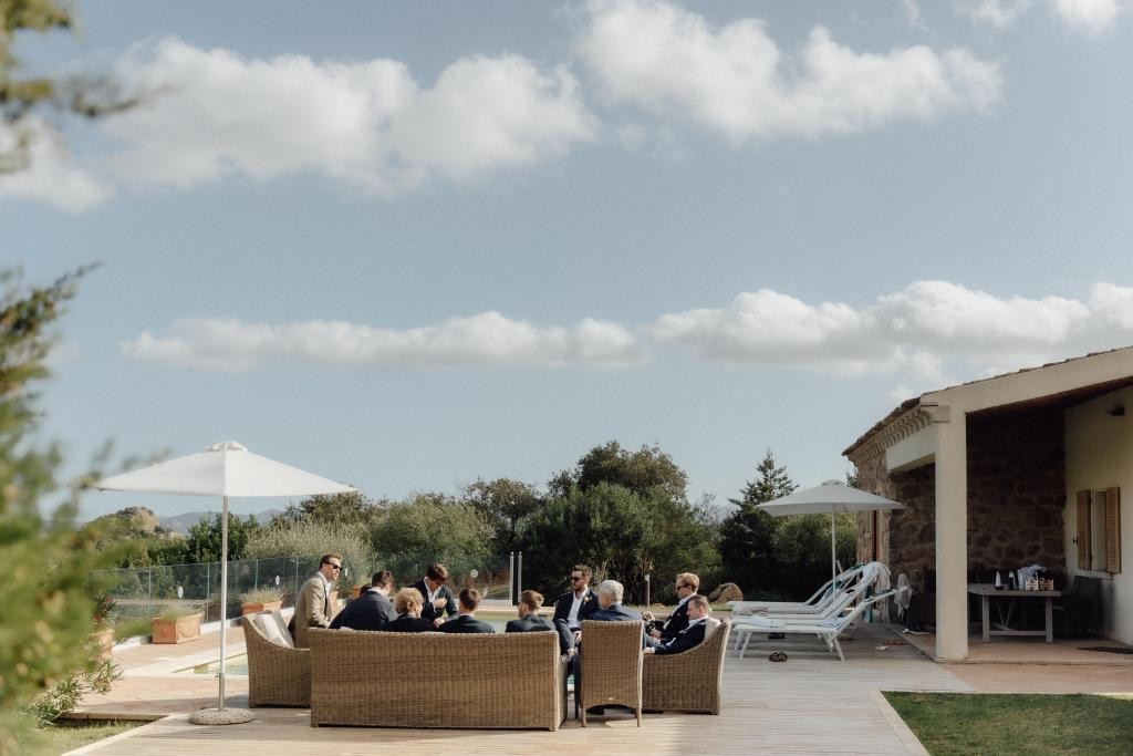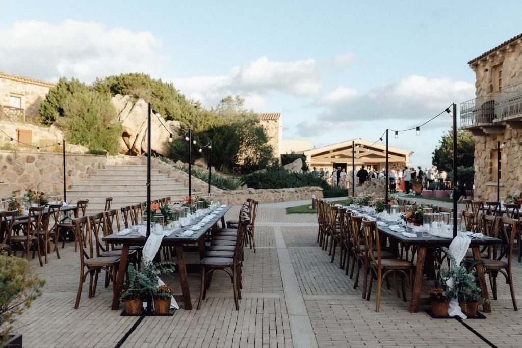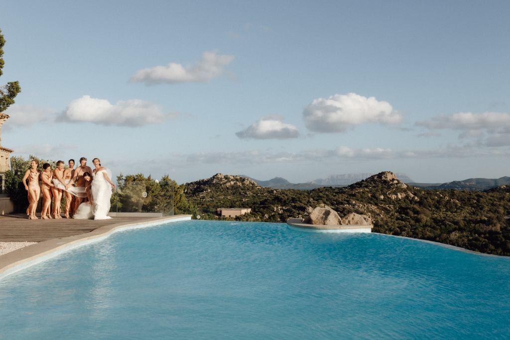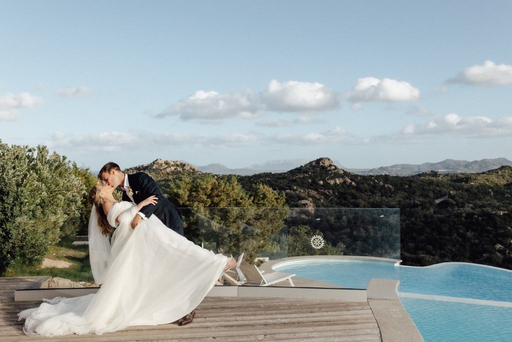 Every moment unfolded seamlessly on site, with everything within walking distance. Their romantic ceremony took place by the villa’s swimming pool, framed by a majestic granite rock—an iconic symbol of Gallura’s rugged beauty.