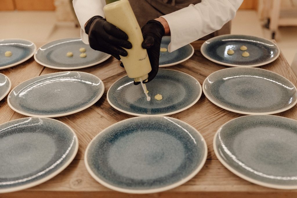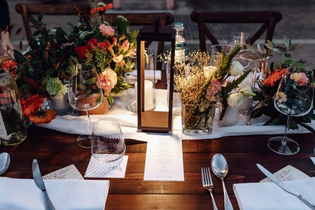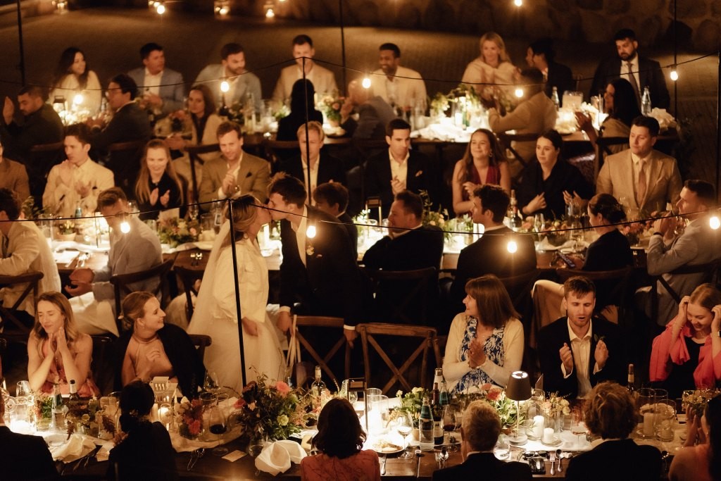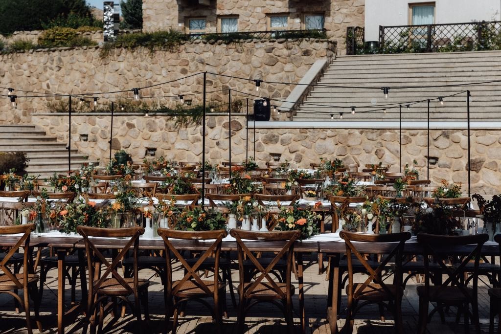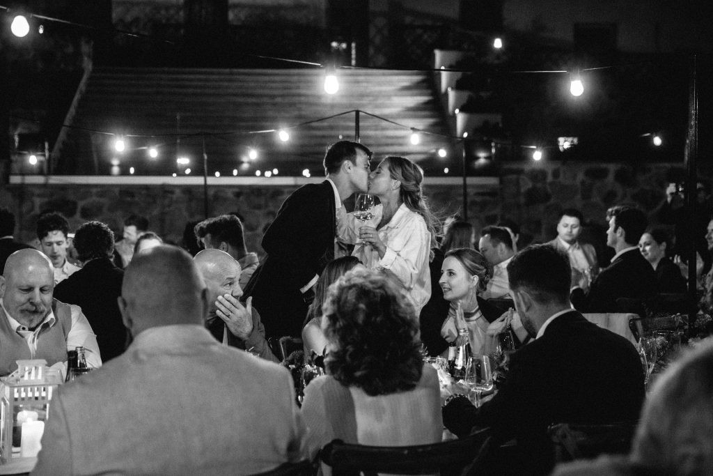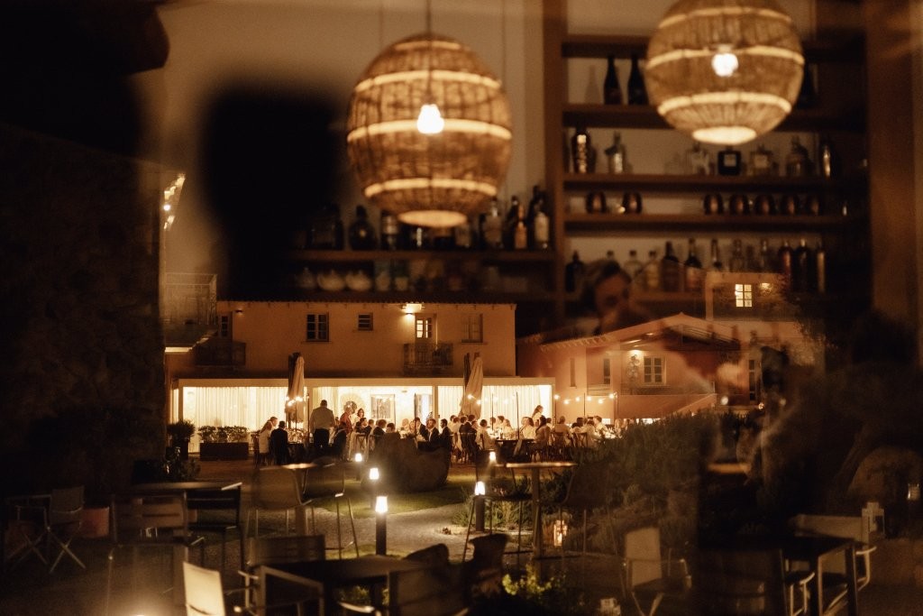 After the vows, guests enjoyed a delightful aperitif outdoors, followed by a magical dinner under the stars in the courtyard. A long banquet table, glowing with fairy lights, set the stage for an evening of togetherness and celebration.