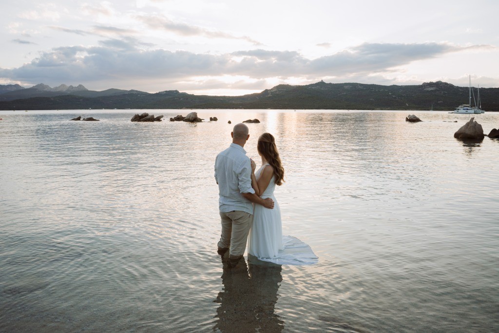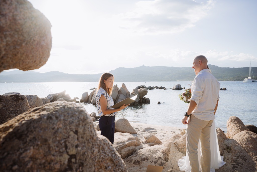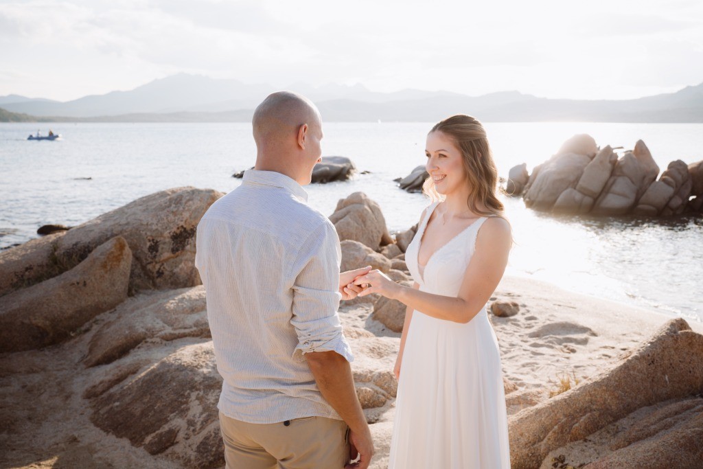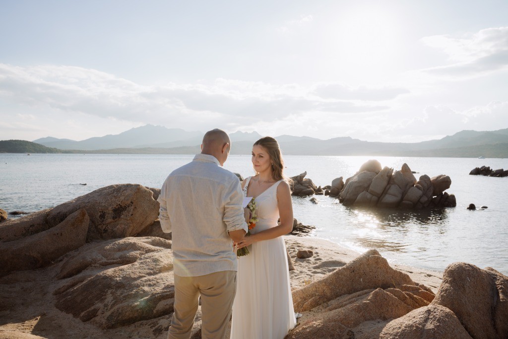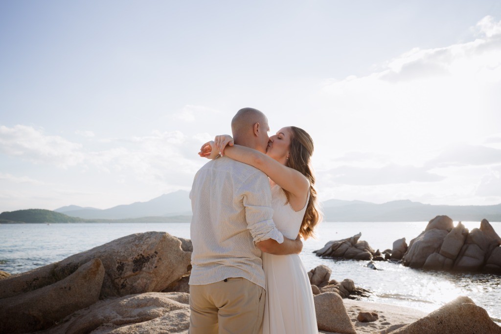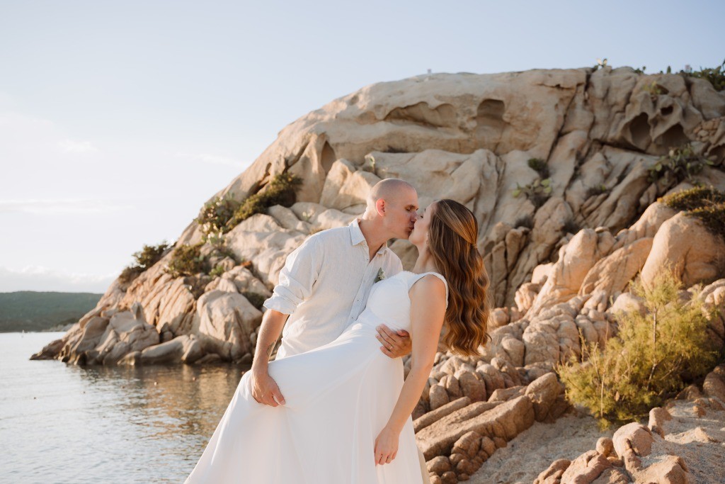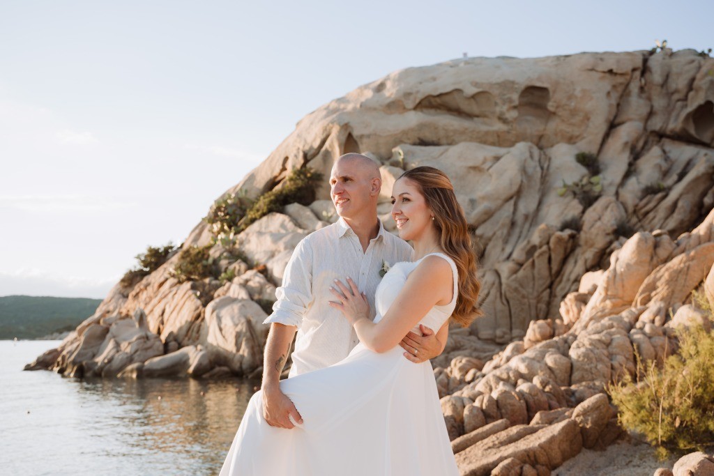 Arriving in Olbia at the close of September, we proposed them a secluded haven for their ceremony. Capriccioli beach, bathed in golden light, offered a breathtaking stage for their elopement. As the sun descended over the Gallura coast, our award-winning celebrant wove a bespoke ceremony crafted just for them. Amid the sculpted rocks, they exchanged vows and rings, their promises carried by the rhythm of the waves.
