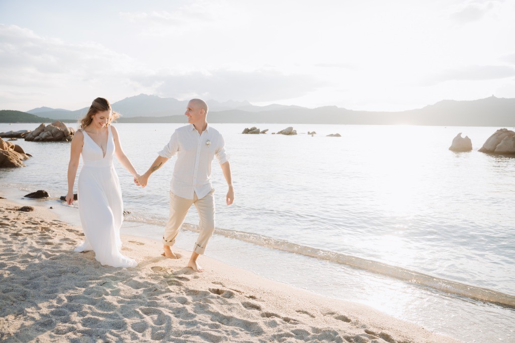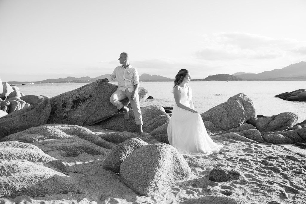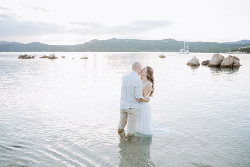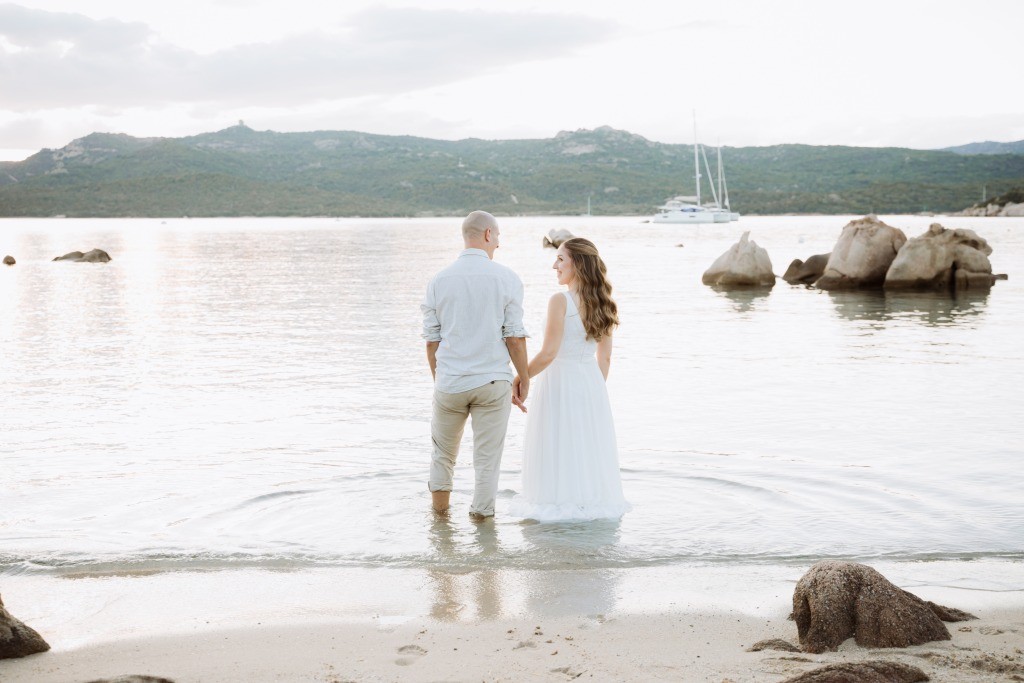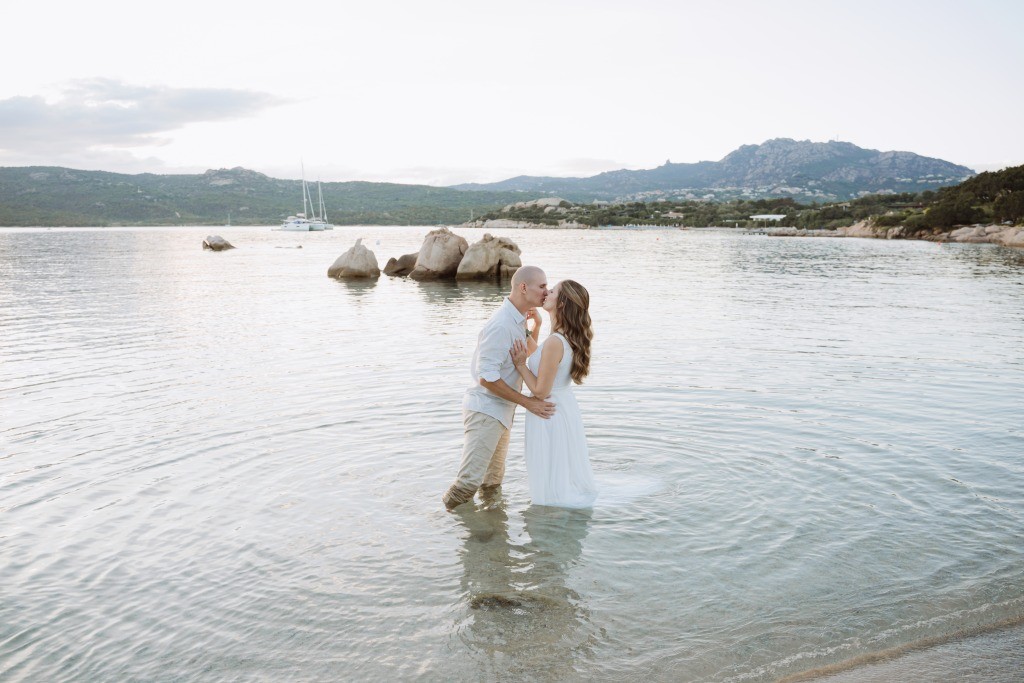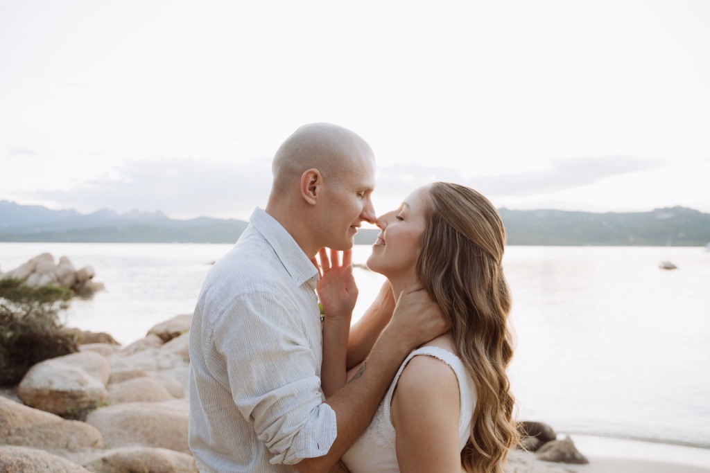 Arriving in Olbia at the close of September, we proposed them a secluded haven for their ceremony. Capriccioli beach, bathed in golden light, offered a breathtaking stage for their elopement. As the sun descended over the Gallura coast, our award-winning celebrant wove a bespoke ceremony crafted just for them. Amid the sculpted rocks, they exchanged vows and rings, their promises carried by the rhythm of the waves.
