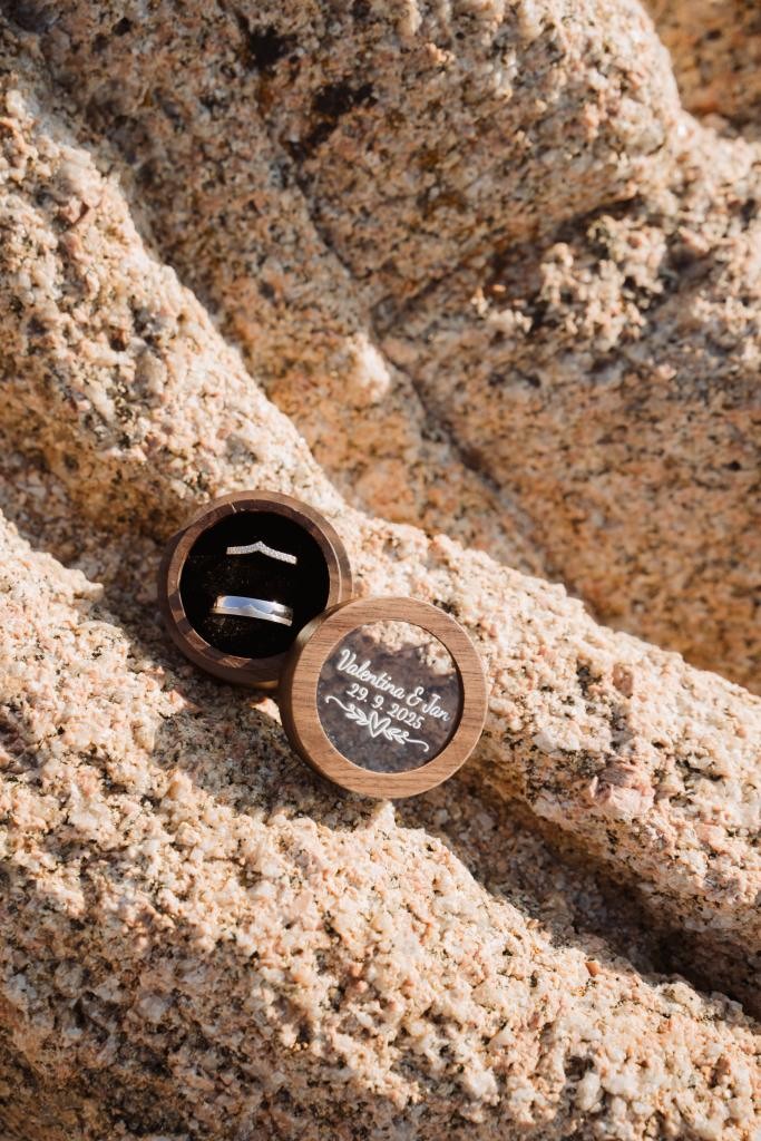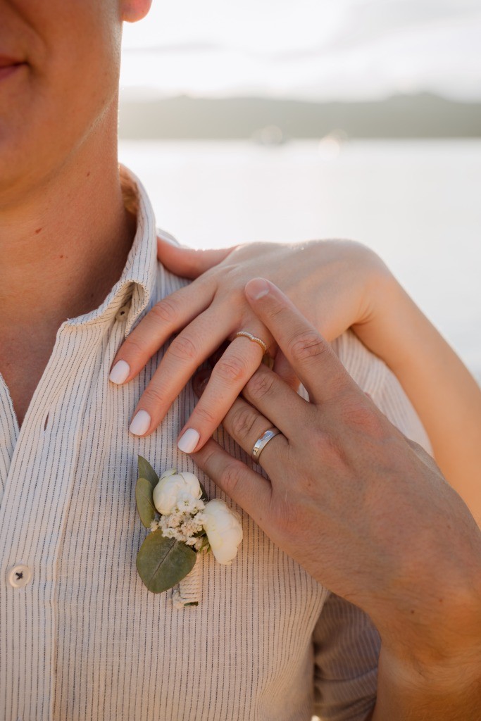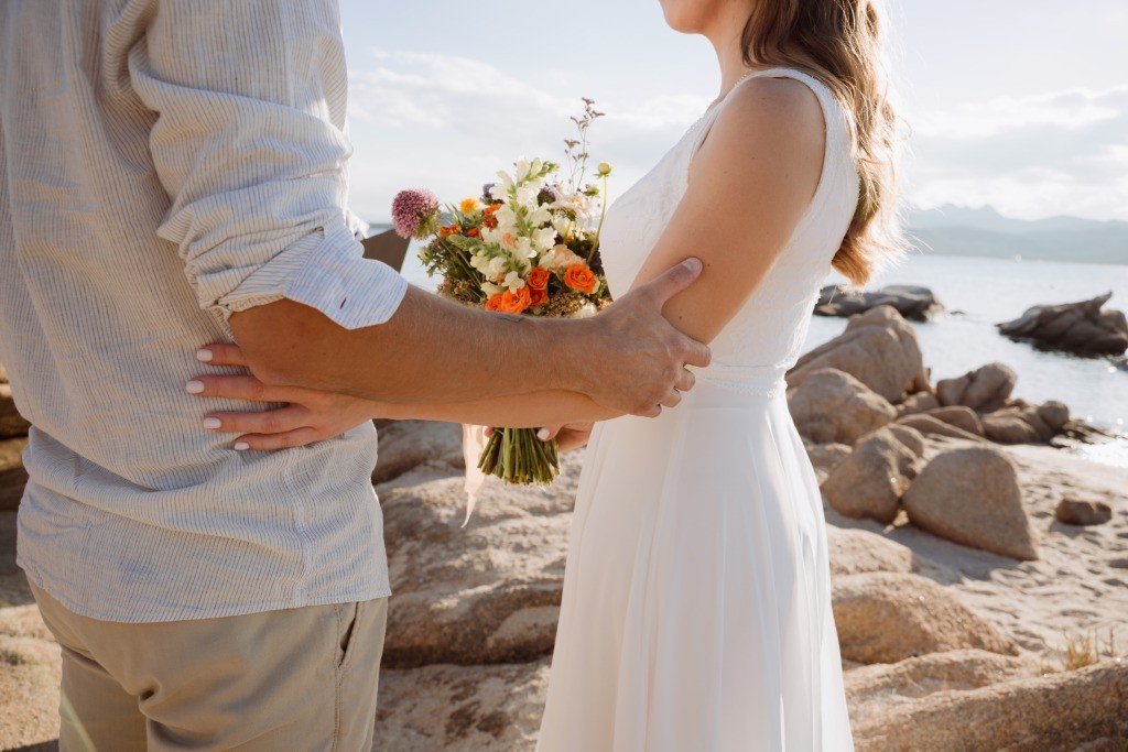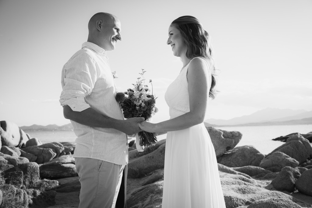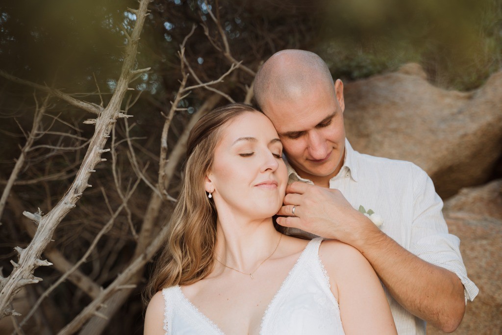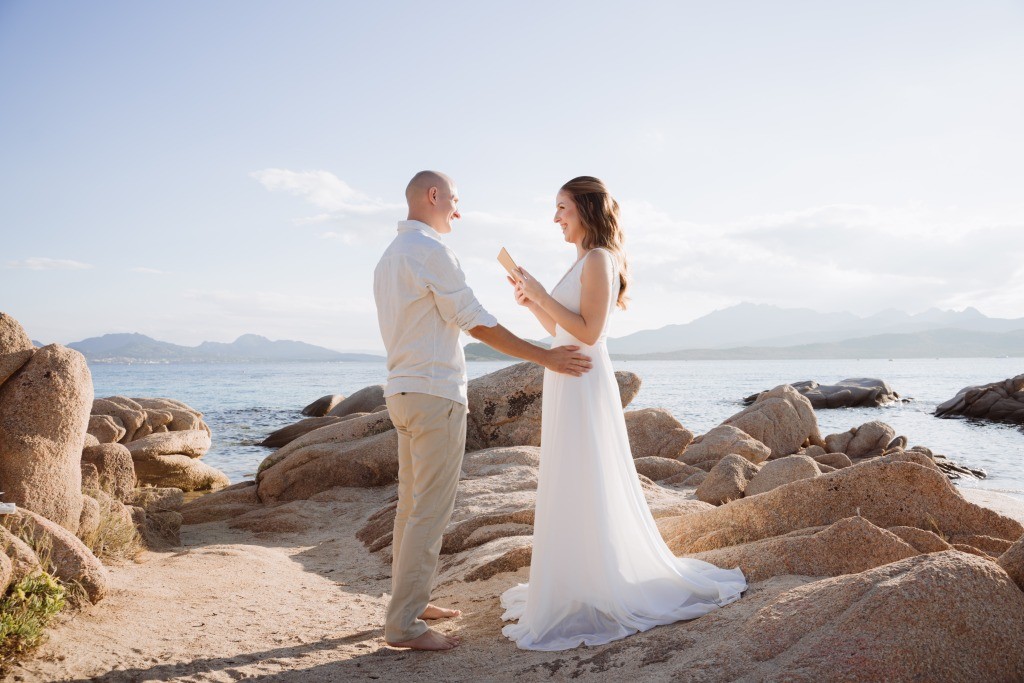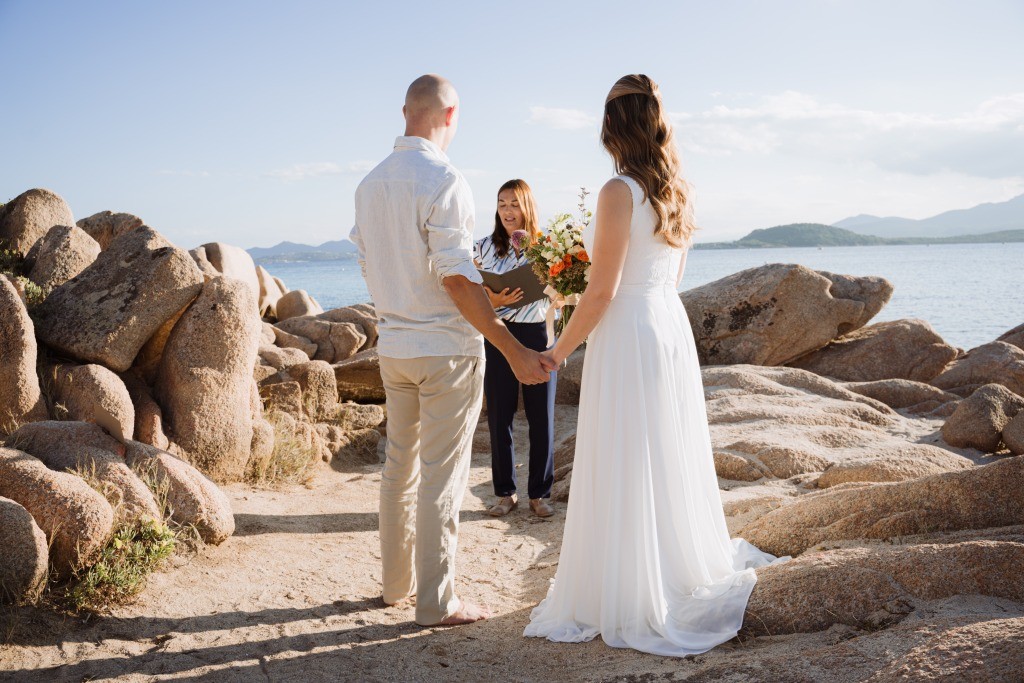Arriving in Olbia at the close of September, we proposed them a secluded haven for their ceremony. Capriccioli beach, bathed in golden light, offered a breathtaking stage for their elopement. As the sun descended over the Gallura coast, our award-winning celebrant wove a bespoke ceremony crafted just for them. Amid the sculpted rocks, they exchanged vows and rings, their promises carried by the rhythm of the waves.
