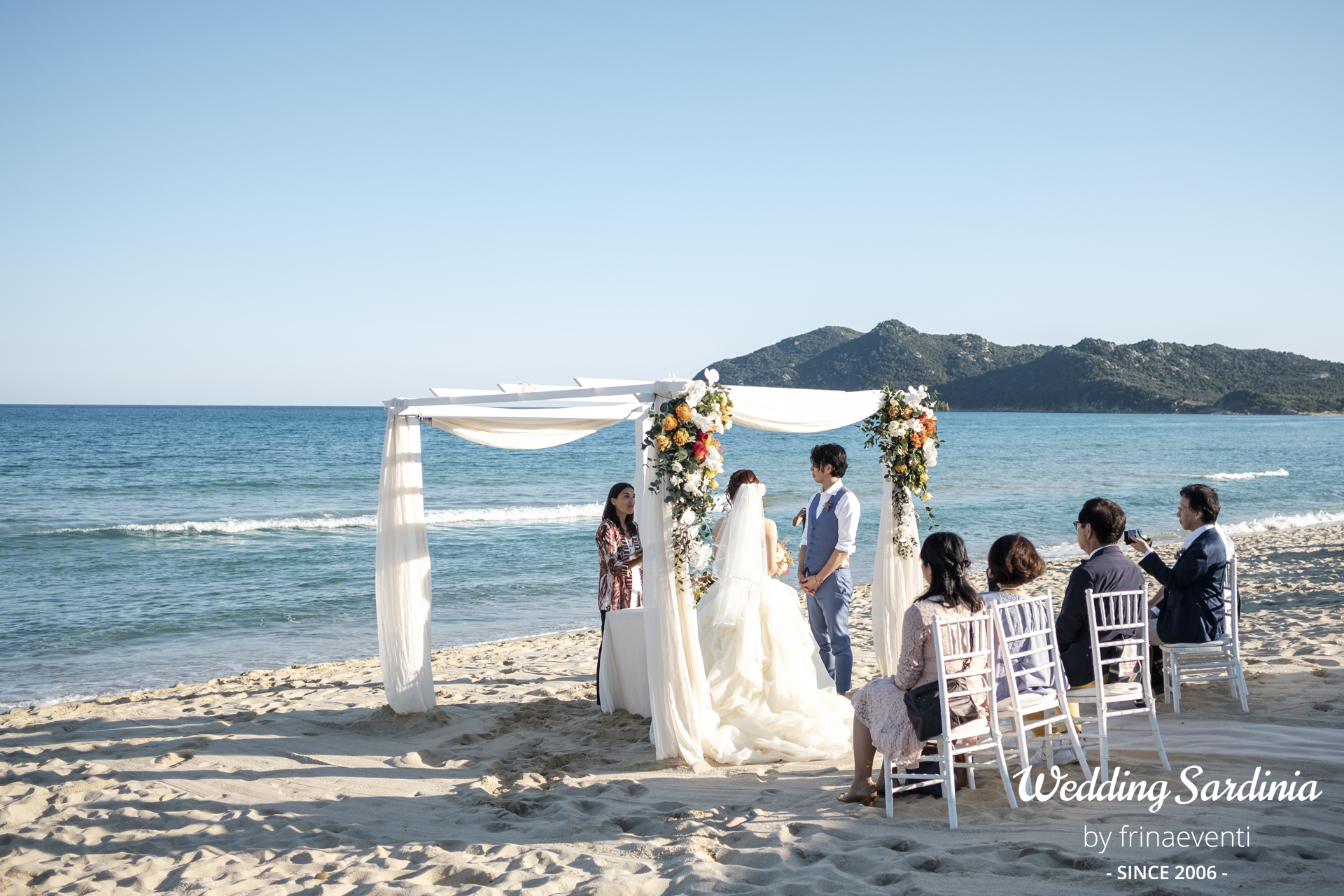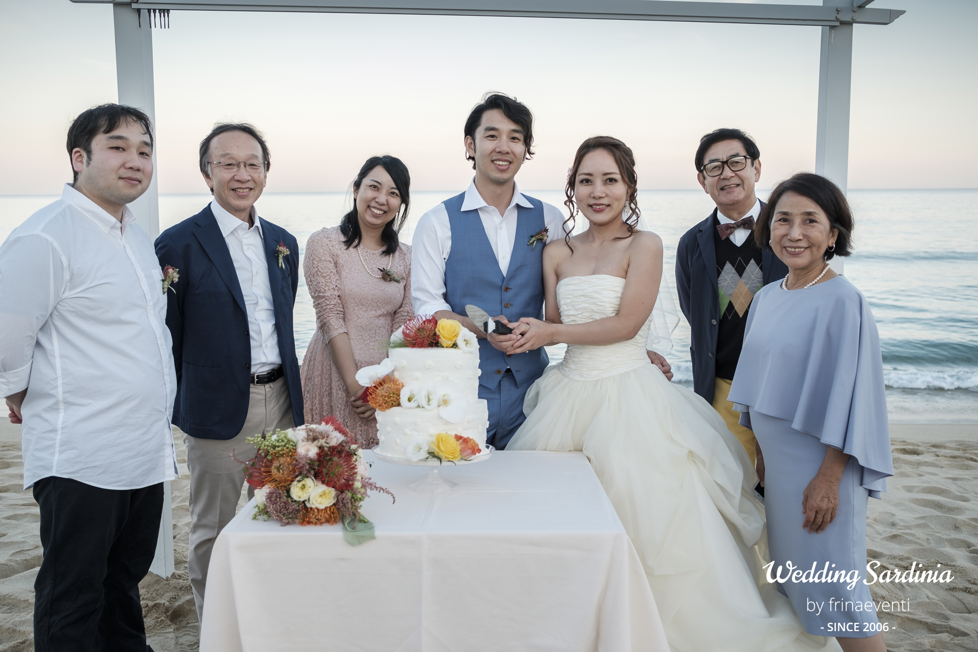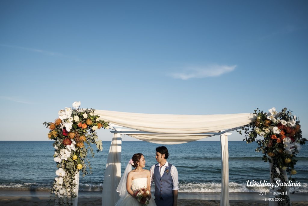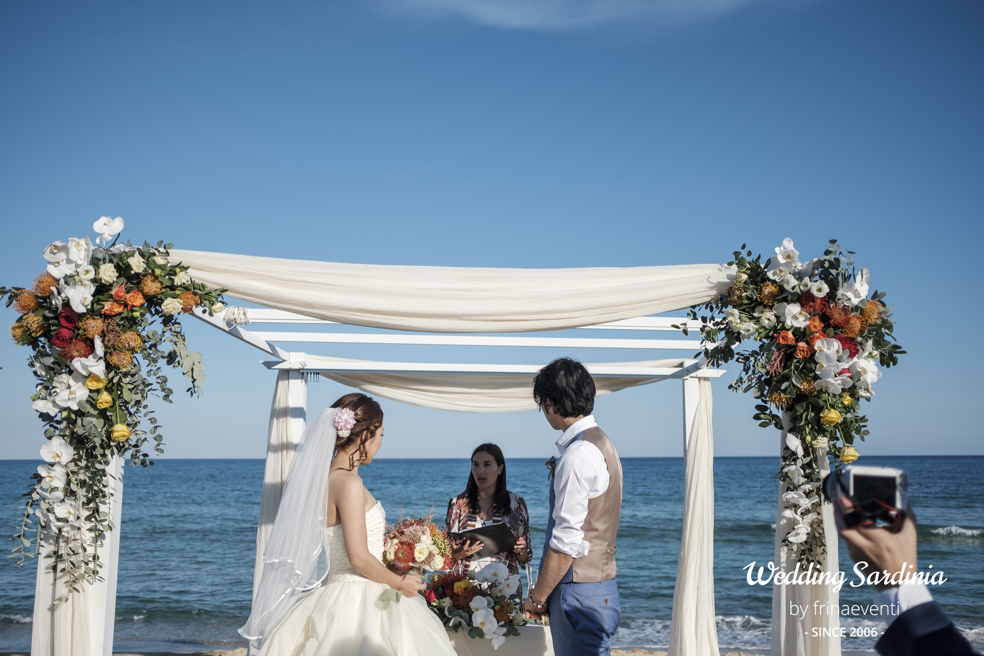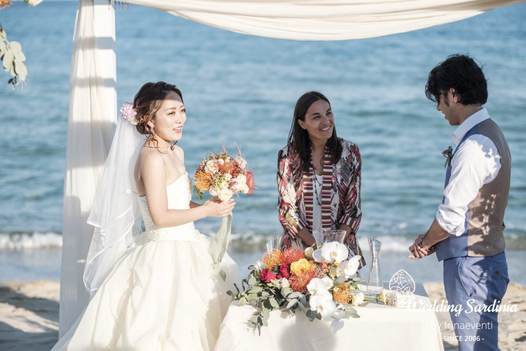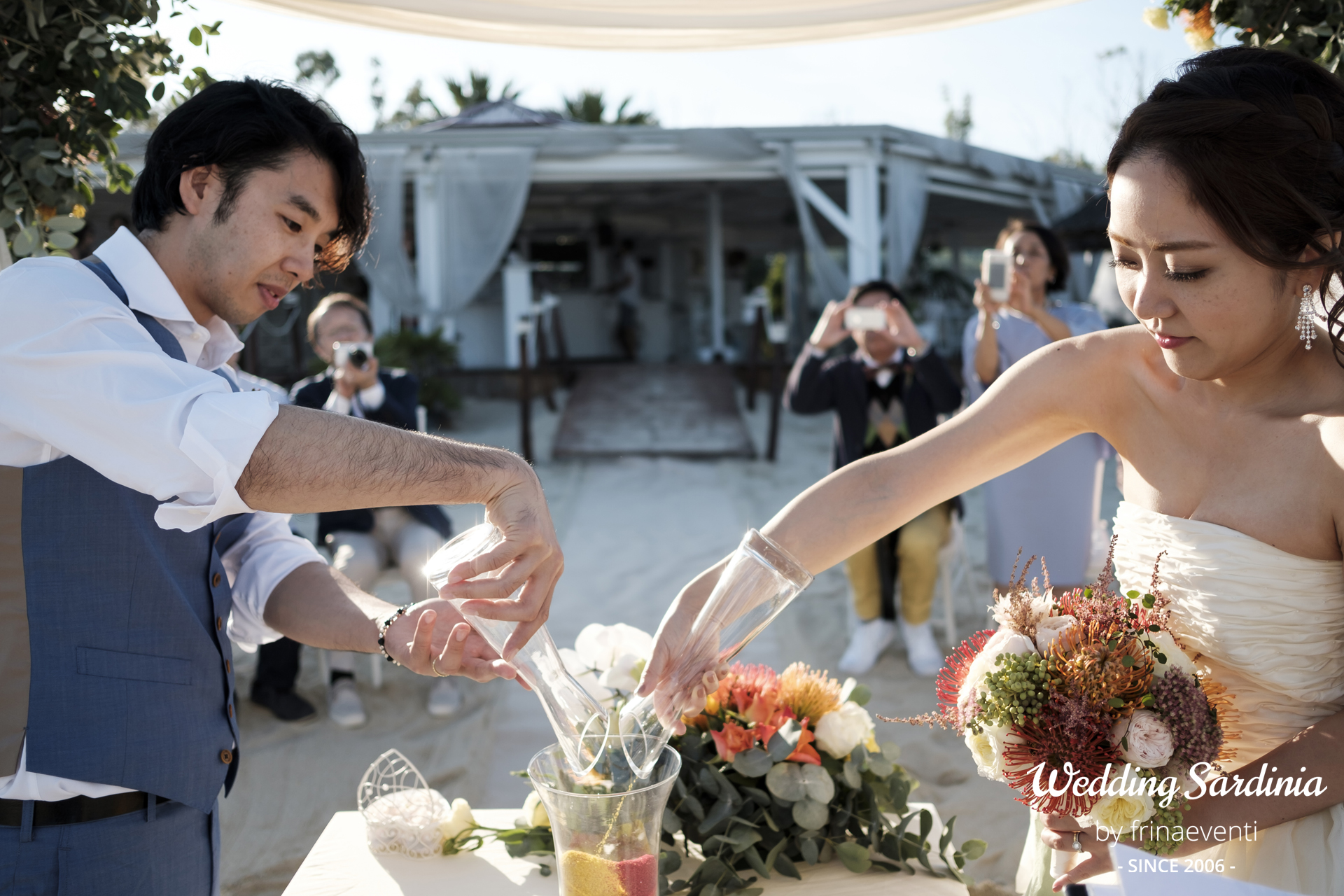 Their union was celebrated by our Humanist Celebrant with a colorful sand ritual ceremony and personal vows in japanese in a lovely beach restaurant in Costarei – South of Sardinia .